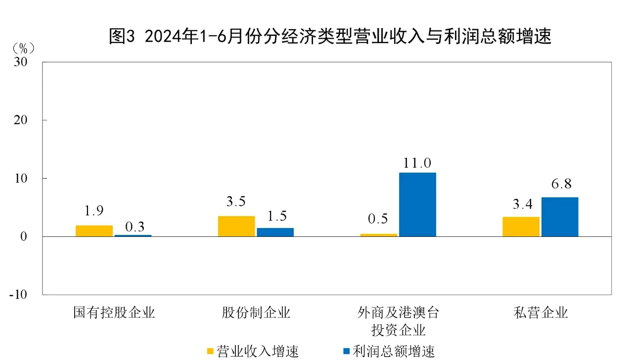 1—6月份,規模以上工業企業中,國有控股企業實現利潤總額12083.9億元,同比增長0.3%;股份制企業實現利潤總額26243.3億元,增長1.5%;外商及港澳臺投資企業實現利潤總額8614.9億元,增長11.0%;私營企業實現利潤總額9193.6億元,增長6.8%。