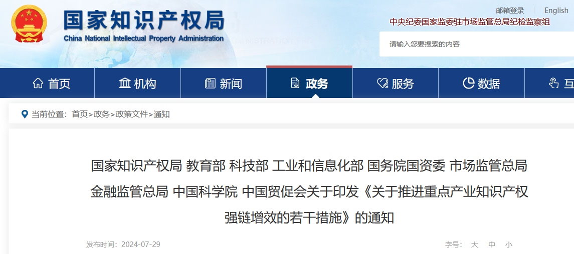 國家知識產權局聯合教育部、科技部、工業和信息化部、國務院國資委、市場監管總局、金融監管總局、中國科學院、中國貿促會制定了《關于推進重點產業知識產權強鏈增效的若干措施》,現印發給你們,請認真貫徹落實。