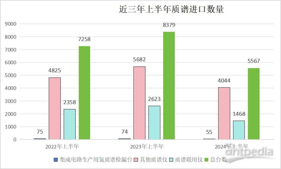 1. 集成電路生產用氦質譜檢漏臺:數量從2022年的75臺逐年下降至2024年的55臺,顯示出這一特定類型的質譜儀需求有所減少。