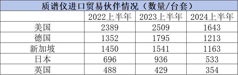 數據顯示2022年上半年、2023年上半年、2024年上半年,質譜進口貿易地區排名前五的均為美國、德國、新加坡、日本、英國。僅僅從2024年上半年進口數量來看,美國1643臺套,占比29.5%,德國1213臺套,占比21.8%,新加坡1163臺套,占比20.9%。從上述三個國家進口數量總占比72.2%。