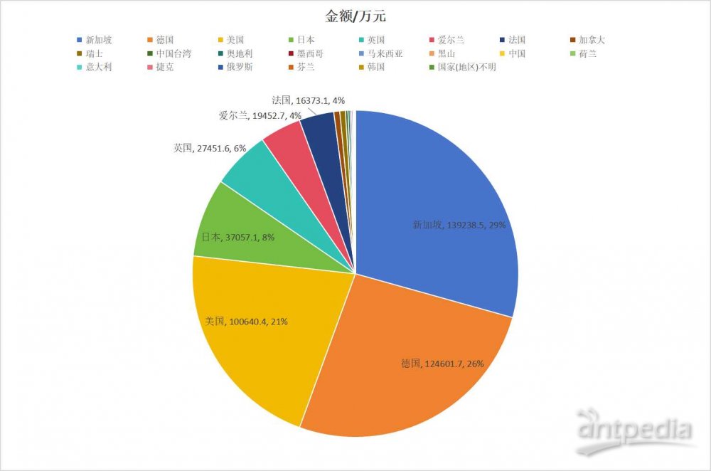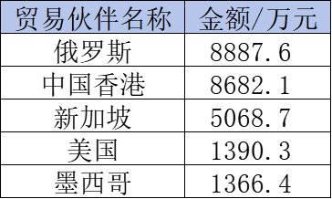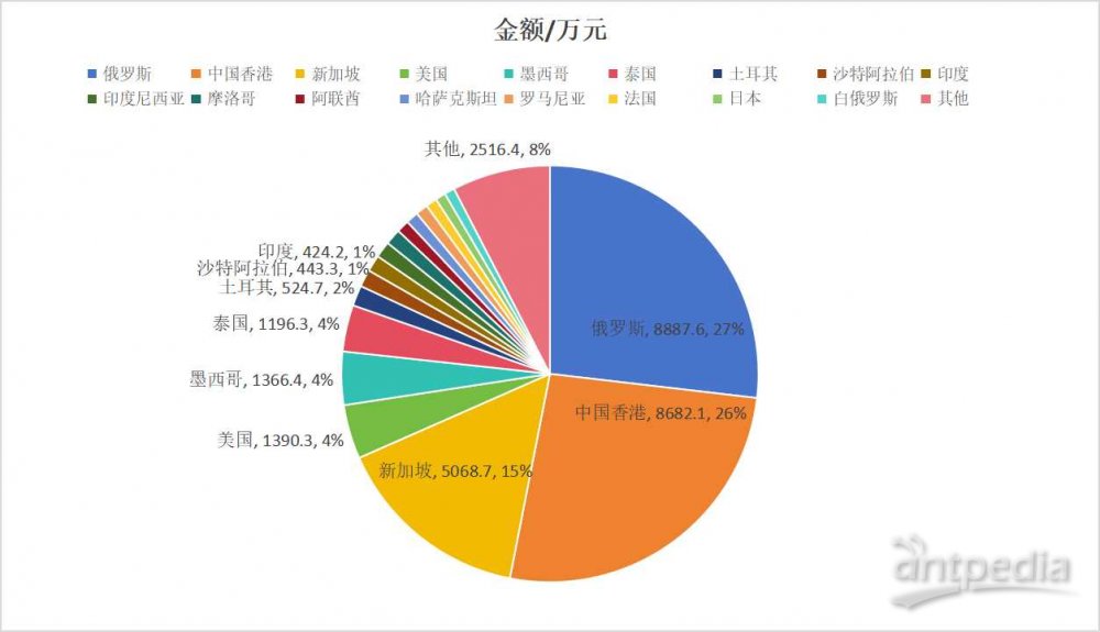 出口質譜儀金額3.3億元,排名前五的國家/地區,俄羅斯8887.6萬元,銷往中國香港8682.1萬元,新加坡5068.7萬元,美國1390.3萬元,墨西哥1366.4萬元。