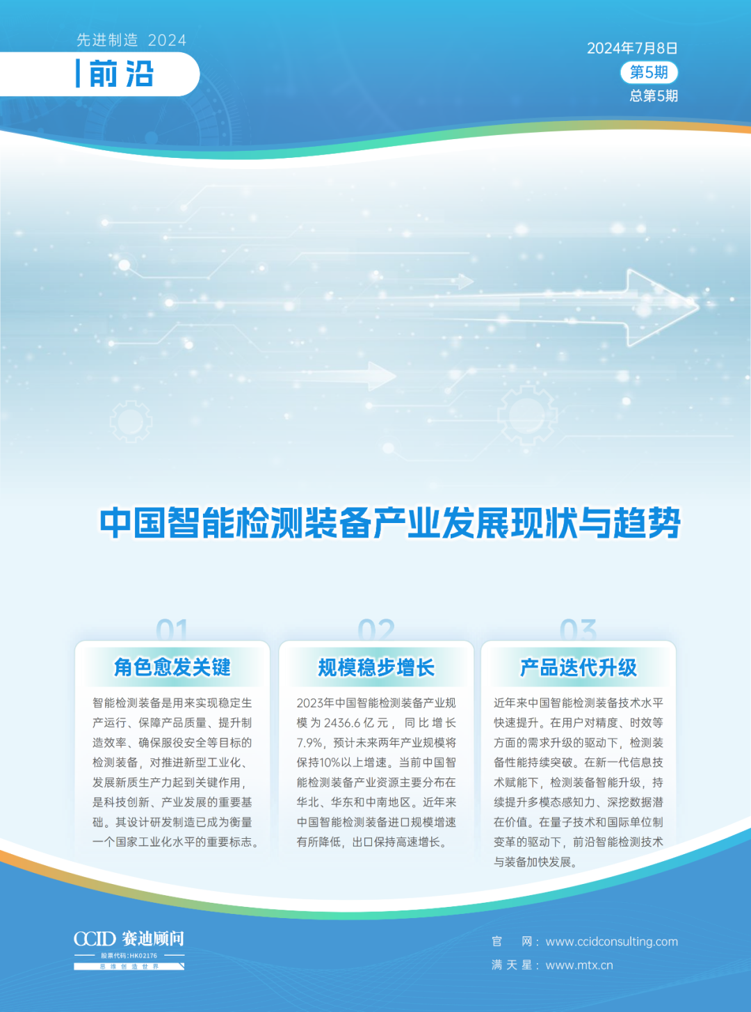 2023年中國(guó)智能檢測(cè)裝備產(chǎn)業(yè)規(guī)模為2436.6億元,較上年增長(zhǎng)7.9%。受?chē)?guó)家推進(jìn)新型工業(yè)化、發(fā)展新質(zhì)生產(chǎn)力、加快工業(yè)設(shè)備更新等利好政策影響,預(yù)計(jì)未來(lái)幾年將持續(xù)保持10%以上的增速,2025年整體產(chǎn)業(yè)規(guī)模將突破3000億元。隨著智能制造深入推進(jìn),智能檢測(cè)裝備需求日益增加,新技術(shù)新產(chǎn)品競(jìng)相涌現(xiàn),產(chǎn)業(yè)呈現(xiàn)快速發(fā)展勢(shì)頭。總體來(lái)看中國(guó)智能檢測(cè)裝備產(chǎn)業(yè)仍存在技術(shù)基礎(chǔ)薄弱、創(chuàng)新能力不強(qiáng)、高端供給不足、產(chǎn)業(yè)體系不完善和應(yīng)用生態(tài)不健全等問(wèn)題,已成為智能制造深入發(fā)展的關(guān)鍵短板和重要制約。黨的二十屆三中全會(huì)公報(bào)指出,高質(zhì)量發(fā)展是全面建設(shè)社會(huì)主義現(xiàn)代化國(guó)家的首要任務(wù)。推進(jìn)智能檢測(cè)裝備發(fā)展是產(chǎn)業(yè)基礎(chǔ)高級(jí)化的重要領(lǐng)域,對(duì)推進(jìn)產(chǎn)業(yè)實(shí)現(xiàn)歷史性變革、系統(tǒng)性重塑、整體性重構(gòu)具有重要價(jià)值。工信部等部門(mén)出臺(tái)的《智能檢測(cè)裝備產(chǎn)業(yè)發(fā)展行動(dòng)計(jì)劃(2023-2025年)》等一系列政策,提出了“到2025年,智能檢測(cè)技術(shù)基本滿(mǎn)足用戶(hù)領(lǐng)域制造工藝需求,核心零部件、專(zhuān)用軟件和整機(jī)裝備供給能力顯著提升,重點(diǎn)領(lǐng)域智能檢測(cè)裝備示范帶動(dòng)和規(guī)模應(yīng)用成效明顯,產(chǎn)業(yè)生態(tài)初步形成“等發(fā)展目標(biāo)。