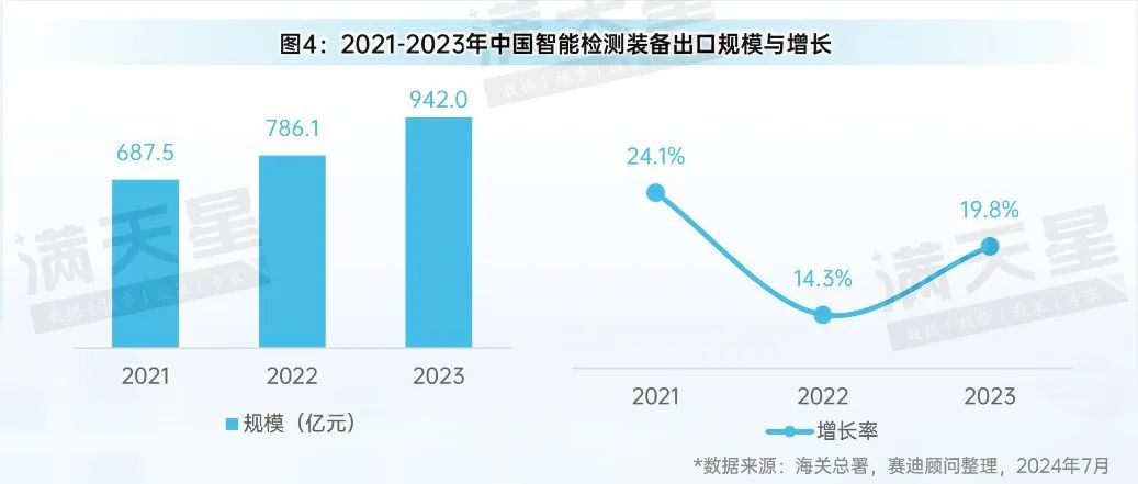 圖4:2021-2023年中國(guó)智能檢測(cè)裝備出口規(guī)模與增長(zhǎng)
