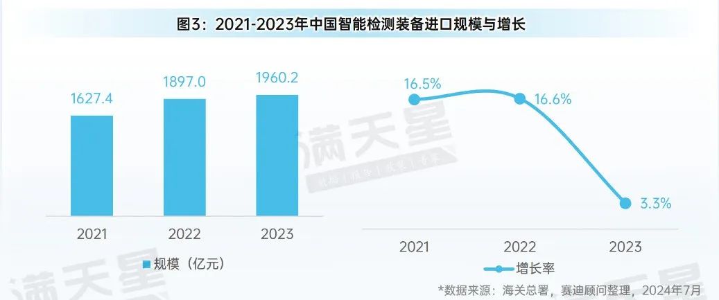 圖3:2021-2023年中國(guó)智能檢測(cè)裝備進(jìn)口規(guī)模與增長(zhǎng)