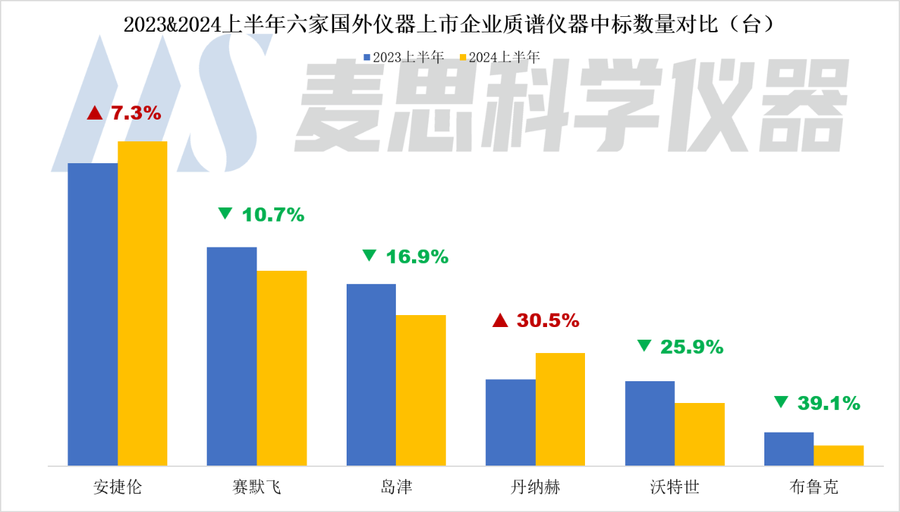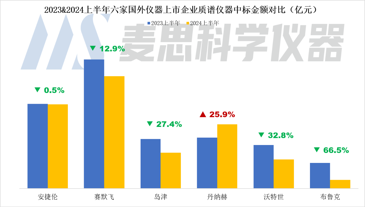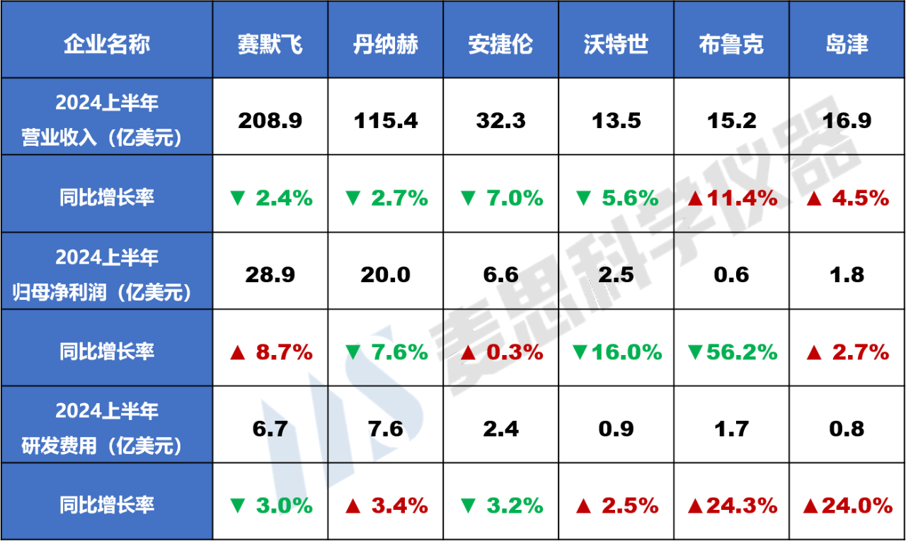 麥思研究院近期對賽默飛、丹納赫、安捷倫、布魯克、沃特世和島津六家國外上市儀器企業的2024上半年度財務數據、中國市場中標情況以及近期企業動態進行了梳理。