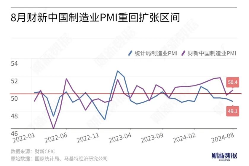 92日公布的8月財新中國制造業采購經理指數(PMI)錄得50.4,較7月回升0.6個百分點,重回榮枯線以上。