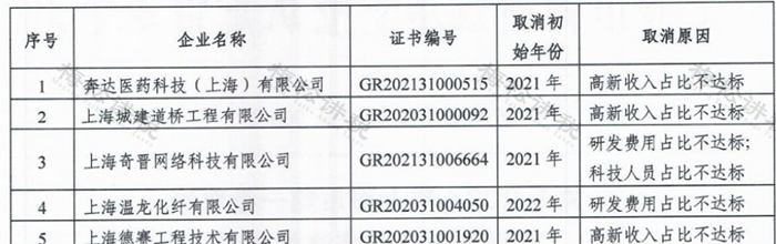 取消原因包括:注銷;研發(fā)費用占比不達標;科技人員占比不達標;未正常開展經(jīng)營活動;累計2年未填報年度發(fā)展報告等。