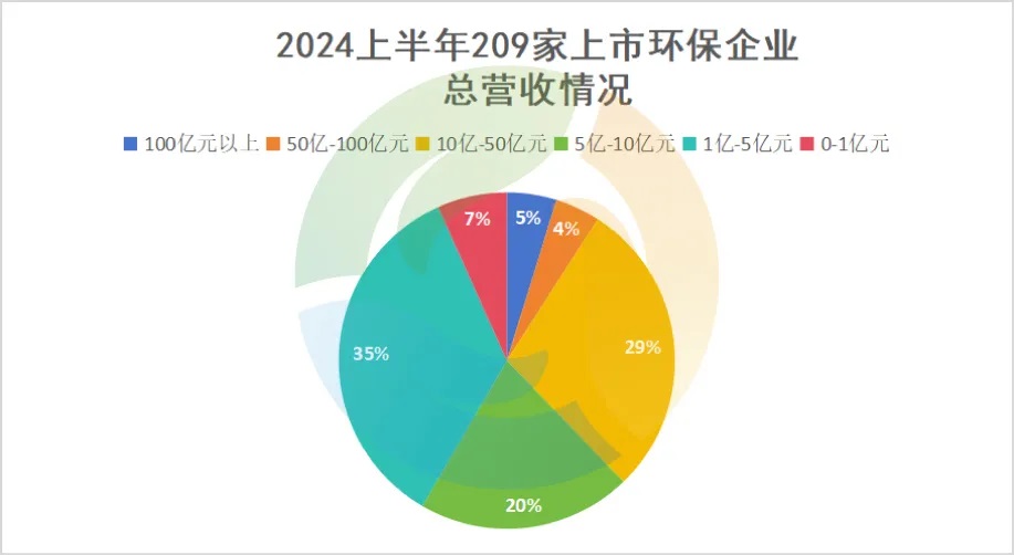 10家環(huán)保企業(yè)進(jìn)入總營收“百億俱樂部”,占比達(dá)5%;此外還有9家環(huán)保企業(yè)總營收處于50-100億元,占比達(dá)4%。也就是說,在2024上半年的210家上市環(huán)保企業(yè)中,9%的環(huán)保企業(yè)總營收超過50億元。