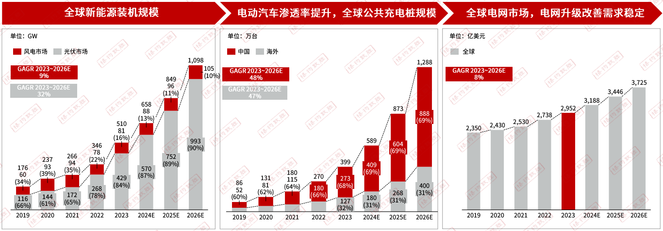 隨著光伏技術(shù)進(jìn)步和產(chǎn)業(yè)規(guī)模化推動,光伏成本持續(xù)降低,世界光伏新增裝機量復(fù)合增長率達(dá)到32%。隨著新能源汽車行業(yè)的發(fā)展,汽車行業(yè)迎來了較高的增長期,與之對應(yīng)的充電樁規(guī)模也隨之高速增長,全球公共充電樁市場規(guī)模以48%的復(fù)合增長率快速增長。全球電網(wǎng)投資穩(wěn)定增長,預(yù)計將以8%的復(fù)合增長率增長,電網(wǎng)升級改善需求穩(wěn)定。