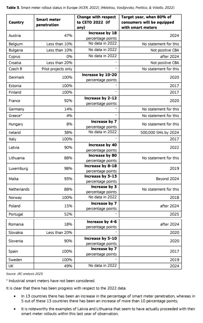 此報告中智能電表的相關數據來源主要是DSO Observatory 2022 的最新版本(2022 年秋季發布)和歐盟能源監管機構合作機構(ACER2022 10月發布的報告。