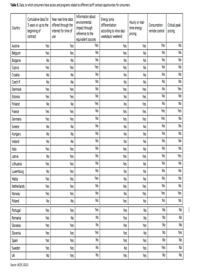 • 根據靈活的電價提供的電力計劃。在這里,我們描述了消費者可以通過智能電表獲得的信息,以及有關通過智能電表提供的資費計劃的信息。表5顯示了消費者可以獲得的歷史消費量,以及有關不同國家/地區通過智能電表提供的靈活關稅產品的信息。這些計劃改善了消費者的賦權,因為它們使客戶能夠調整電力消耗并利用動態電價。為了讓計劃生效,客戶需要對價格信號做出反應。預計從 2023 年起將不再提供固定價格合同,而《電力內部市場指令》規定,成員國必須確保配備智能電表的消費者能夠至少從一家供應商(擁有超過 200,000 名客戶)獲得動態價格合同。應向消費者明確此類合同的特征(ACER2022 年)。