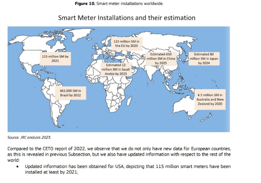 • 全球安裝了超過12億臺智能電表,其中歐洲、澳大利亞和北美是該領域的先驅,僅在歐盟安裝了超過 1.23 億臺智能電表(小編補充:中國迄今已安裝超過6億只智能電表)。