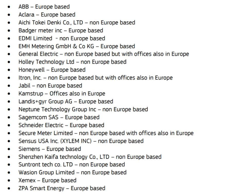 附下是一些智能電表市場領先者的名單(按字母順序,并非詳盡無遺),證明了全球智能電表計劃的合理性。正如我們所看到的,歐洲制造商在該領域擁有強大的影響力。除了列出制造商外,還試圖根據其所在地對制造商進行分類,以確定歐洲制造商。雖然對于一些制造商來說,他們的分類相當簡單,但對于其他制造商來說,很難說,因為他們在世界各地都有活動,而對于其他制造商來說,信息不足以斷定他們是否在歐洲也有辦事處。以下列表給出了歐洲制造商在該領域的存在,并表明了這種情況。