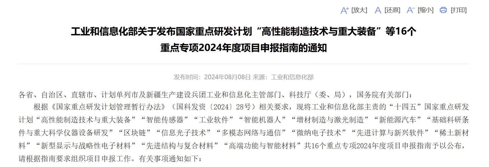 近期,工信部國家重點(diǎn)研發(fā)計(jì)劃2024年度項(xiàng)目申報(bào)指南發(fā)布,共涵蓋“高端功能與智能材料、先進(jìn)結(jié)構(gòu)與復(fù)合材料、新型顯示與戰(zhàn)略性電子材料、高性能制造技術(shù)與重大裝備、微納電子技術(shù)、新能源汽車”等在內(nèi)16個(gè)重點(diǎn)專項(xiàng)。