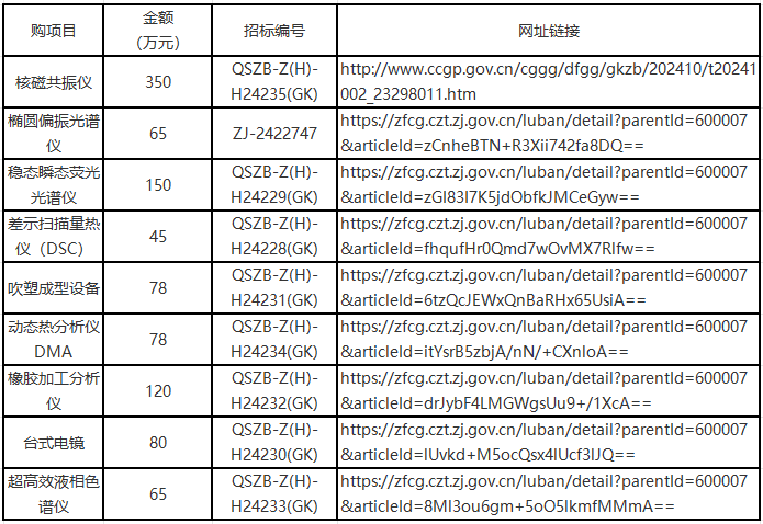 近期,浙江求是招標(biāo)代理有限公司關(guān)于浙江理工大學(xué)一批設(shè)備發(fā)布公開(kāi)招標(biāo)公告,本網(wǎng)匯總這批采購(gòu)項(xiàng)目,該套招標(biāo)總價(jià)超1000萬(wàn),涵蓋核磁、光譜、超高效液相色譜、電鏡、量熱儀DSC、動(dòng)態(tài)熱分析儀DMA等設(shè)備。詳見(jiàn)下表: