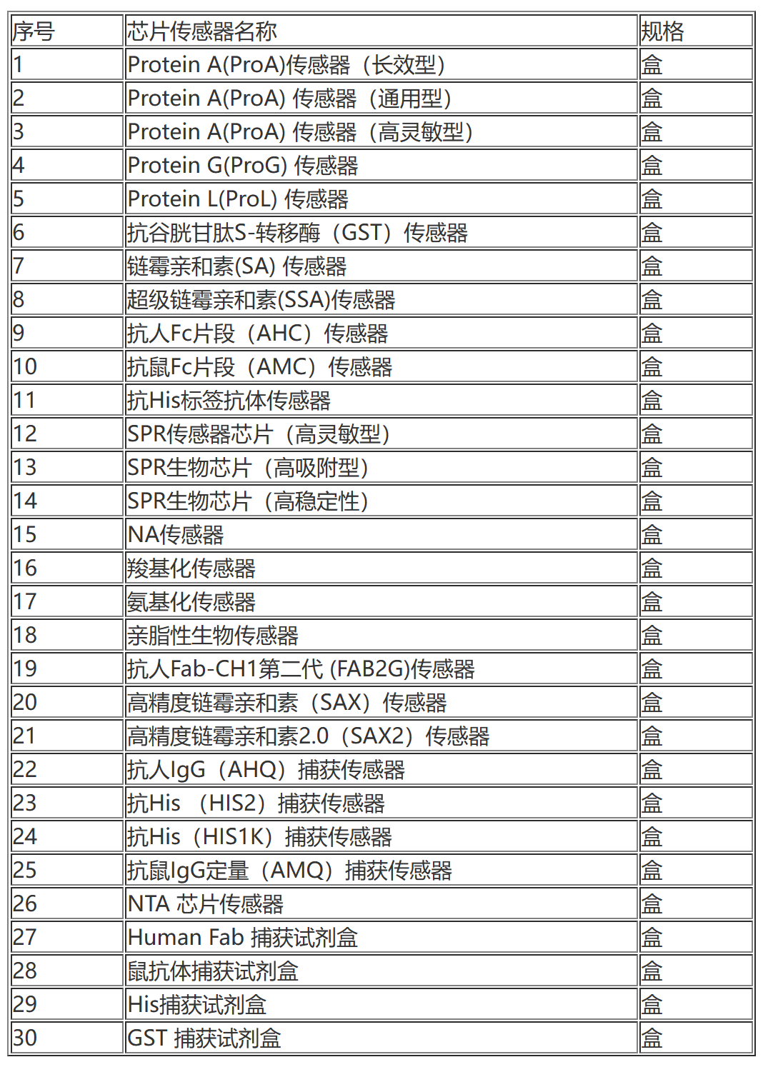 值得留意的是,本次采購的貨物表面等離子共振分子互作儀對配套的40個芯片試劑盒列出了詳細清單,以滿足用戶依據研究課題方向自由組合的需求。