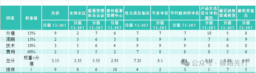 根據(jù)以上的拉分項(xiàng),我們將從這些項(xiàng)目在申報(bào)綠色工廠時(shí)所占的分值,實(shí)施的周期,實(shí)施的難易程度,實(shí)施的費(fèi)用進(jìn)行權(quán)重分析打分,來對申報(bào)綠色工廠時(shí)必要的補(bǔ)足材料進(jìn)行一個(gè)綜合性的排序。