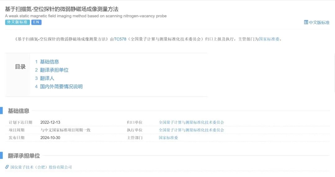 近日,國家市場監(jiān)督管理總局(國家標準化管理委員會)發(fā)布2024年第27號公告,由國儀量子技術(shù)(合肥)股份有限公司牽頭制定的《基于掃描氮-空位探針的微弱靜磁場成像測量方法》(A weak static magnetic field imaging method based on scanning nitrogen-vacancy probe)國家標準外文版正式發(fā)布實施。國家標準外文版的制定,有利于消除國際貿(mào)易屏障,加強國際技術(shù)交流,同時為將來國際標準的制定奠定基礎(chǔ)。