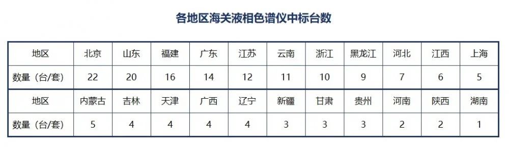 截至2024年12月31日,依據(jù)中國政府采購網(wǎng)公開信息不完全統(tǒng)計,在已公布的中標(biāo)結(jié)果中,全國22個省、直轄市、自治區(qū)的海關(guān)相關(guān)單位完成了液相色譜儀采購中標(biāo)工作。此次共中標(biāo)167臺(套)液相色譜儀,總中標(biāo)(成交)金額超8562萬元人民幣,共有11家品牌成功中標(biāo)。