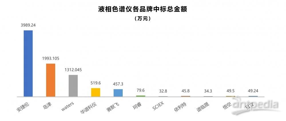 從總金額來看,安捷倫以3989.24萬元位居首位,占整體中標(biāo)金額的47.6%;島津(1993.105萬元)、Waters(1312.045萬元)、華譜科儀(519.6萬元)和賽默飛(457.3萬元)分列二至五位。值得一提的是華譜科儀,其以中標(biāo)總金額519.6萬元排名第四,在本次海關(guān)設(shè)備更新的液相色譜招標(biāo)中,堪稱一匹黑馬。