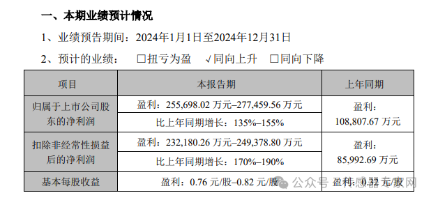 經(jīng)財務(wù)部門初步測算,預(yù)計 2024 年實現(xiàn)歸屬于母公司所有者的凈利潤為315,529.74 萬元到 335,529.74 萬元,與上年同期相比,將增加 259,967.34 萬元到279,967.34 萬元,同比增加 467.88%503.88%