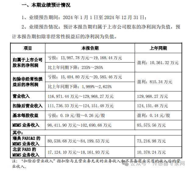 報告期內(nèi),歸屬于上市公司股東的凈利潤為-13,987.78 萬元~-19,168.44 萬元,比上年同期下降235%285%,扣除非經(jīng)常性損益后的凈利潤 為-15,404.80 萬元~-20,585.46 萬元,比上年同期下降1,989%2,625%,營業(yè)收入116,971.44 萬元~129,968.27 萬元,MEMS 業(yè)務(wù)收入98,411.90 萬元~102,690.68 萬元,瑞典 FAB1&2 MEMS 業(yè)務(wù)收入80,538.68 萬元~84,199.53 萬元 ,北京 FAB3 MEMS 業(yè)務(wù)收入17,124.10 萬元~18,161.93 萬元。