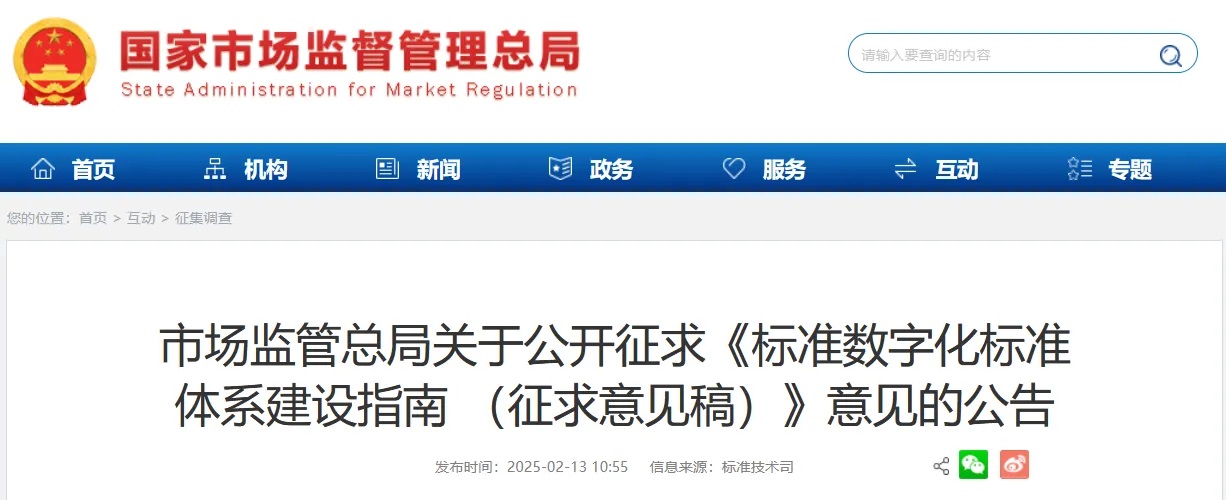 為深入貫徹落實(shí)黨中央、國(guó)務(wù)院關(guān)于推動(dòng)標(biāo)準(zhǔn)化工作向數(shù)字化、網(wǎng)絡(luò)化、智能化轉(zhuǎn)型的決策部署,實(shí)施《國(guó)家標(biāo)準(zhǔn)化發(fā)展綱要》和《質(zhì)量強(qiáng)國(guó)建設(shè)綱要》,充分發(fā)揮標(biāo)準(zhǔn)的基礎(chǔ)性、引領(lǐng)性作用,加快構(gòu)建結(jié)構(gòu)合理、層次分明、適應(yīng)經(jīng)濟(jì)社會(huì)高質(zhì)量發(fā)展的標(biāo)準(zhǔn)數(shù)字化標(biāo)準(zhǔn)體系。市場(chǎng)監(jiān)管總局起草了《標(biāo)準(zhǔn)數(shù)字化標(biāo)準(zhǔn)體系建設(shè)指南 (征求意見稿)》,現(xiàn)向社會(huì)公開征求意見,意見反饋截止日期為2025年3月12日。公眾可以通過以下途徑和方式提出意見: