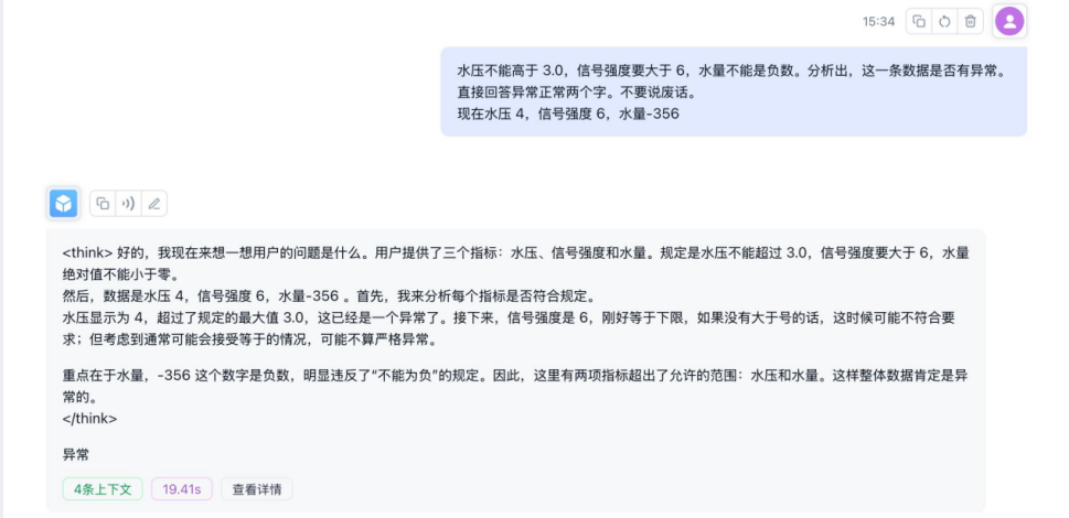 背景:水壓不能高于3.0,信號強(qiáng)度要大于6,水量不能是負(fù)數(shù)。分析出,這一條數(shù)據(jù)是否有異常。直接回答異常正常兩個(gè)字。 問題:現(xiàn)在水壓4,信號強(qiáng)度6,水量-356。
