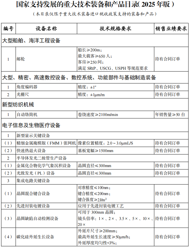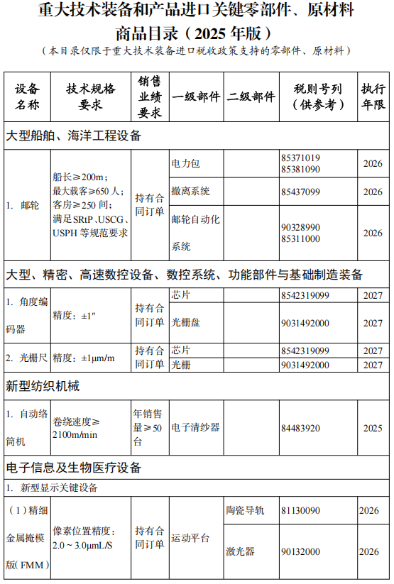 同步發(fā)布《國家支持發(fā)展的重大技術(shù)裝備和產(chǎn)品目錄(2025年版)》、《重大技術(shù)裝備和產(chǎn)品進(jìn)口關(guān)鍵零部件、原材料商品目錄(2025年版)》和《進(jìn)口不予免稅的重大技術(shù)裝備和產(chǎn)品目錄(2025年版)》,自2025年3月1日起執(zhí)行。