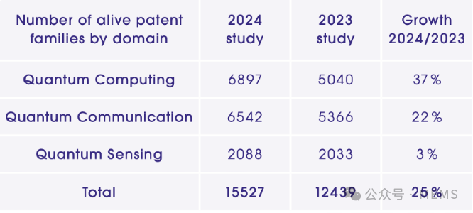 2024年,量子計算和量子通信領域的專利族占比明顯高于量子傳感,三者的占比分別為44%、42%和14%。從2023年~2024年的增長率來看,量子計算和量子通信領域的專利增長也顯著高于量子傳感領域,三者的增長率分別為37%、22%和3%。反映了當前全球量子技術領域的發(fā)展熱點和重點方向。