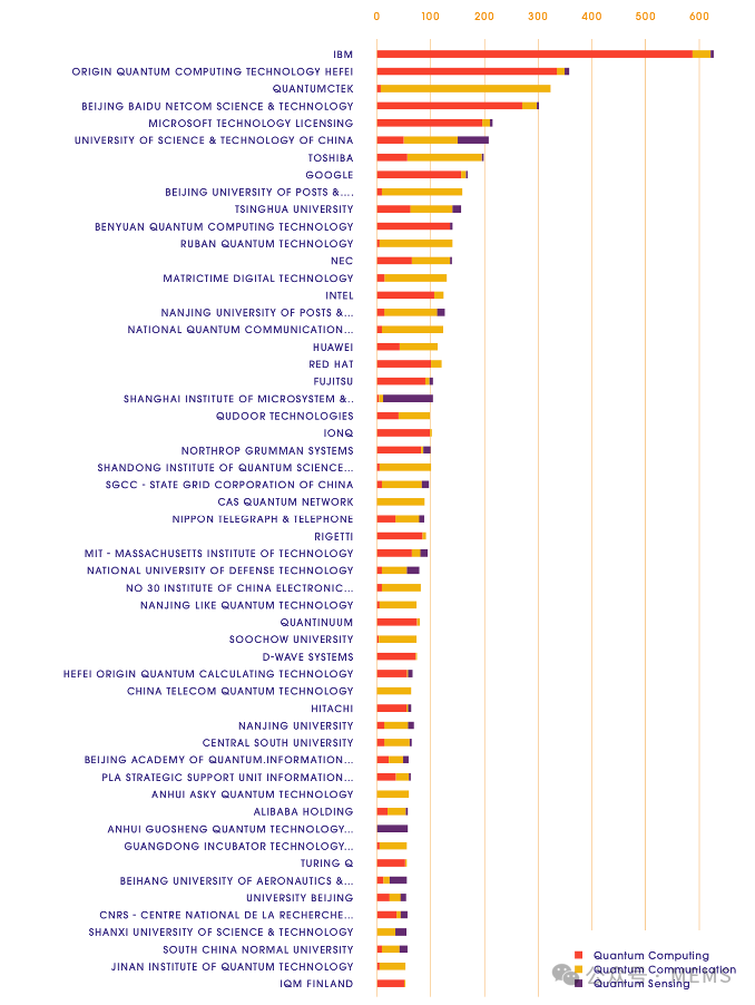 按技術類型細分,來自中國排名前三的機構,本源量子計算科技(合肥)股份有限公司和北京百度網(wǎng)訊科技有限公司主要聚焦量子計算技術,科大國盾量子技術股份有限公司則主要聚焦量子通信技術。在量子傳感技術領域有大量專利布局的中國機構有:中國科學技術大學、中國科學院上海微系統(tǒng)與信息技術研究所、安徽省國盛量子科技有限公司以及北京航空航天大學等。