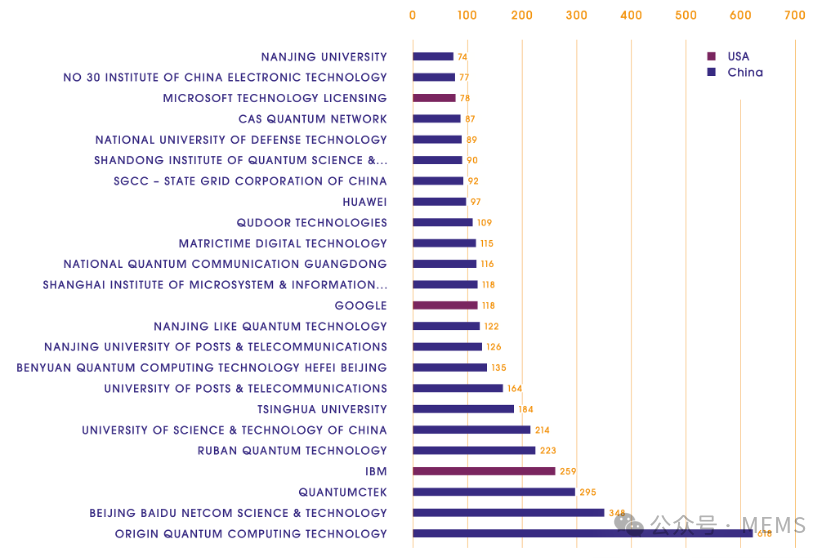 在中國申請的量子技術專利按申請量排名,前25位專利申請人中,除了三家來自美國的申請人(IBM、谷歌和微軟),其他全部為中國本土機構,包括本源量子計算科技(合肥)股份有限公司、北京百度網(wǎng)訊科技有限公司、科大國盾量子技術股份有限公司、如班量子科技有限公司、中國科學技術大學、清華大學、北京郵電大學及南京郵電大學等。