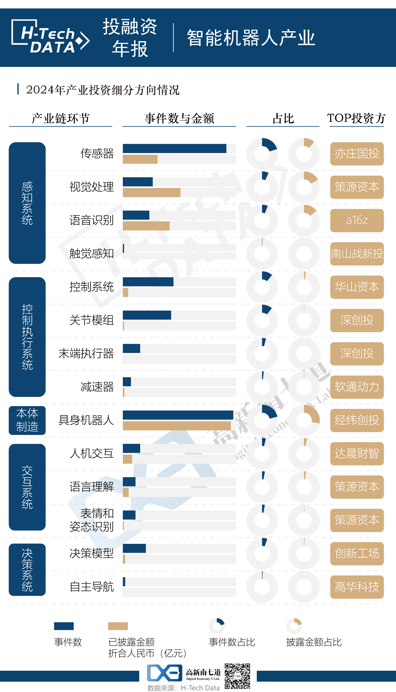 細(xì)分來看,機(jī)器人本體制造環(huán)節(jié)投資事件數(shù)量和金額最多,而感知系統(tǒng)緊隨其后,其中傳感器在感知系統(tǒng)中投資事件和金額占絕大多數(shù),事件數(shù)量上,感知系統(tǒng)-傳感器、視覺處理、語音識別合計(jì)收獲66起融資,占比18.6%。