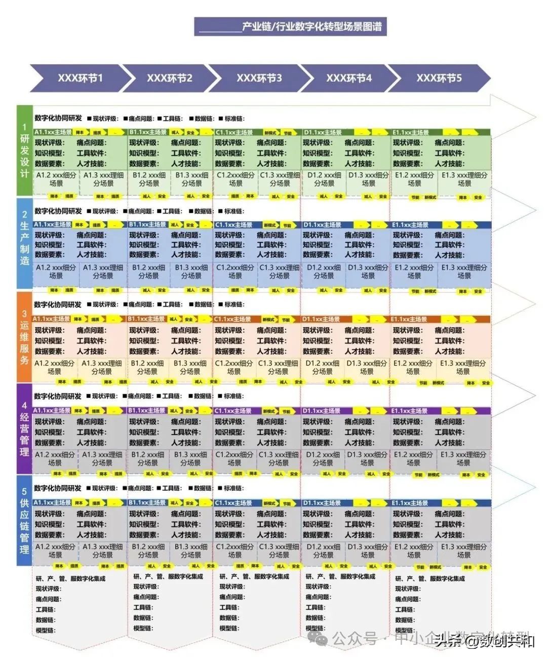 聚焦產業鏈上下游企業研發設計、生產制造、運維服務、經營管理、供應鏈管理等場景,以場景為切入點梳理數字化轉型痛點需求,繪制重點行業、重點產業鏈數字化轉型場景圖譜(簡稱“一圖譜”),明確企業數字化轉型路徑,促進產業鏈上下游企業協同開展轉型升級。分場景梳理數據要素、知識模型、工具軟件、人才技能等數字化轉型要素清單(簡稱“四清單”,合稱“一圖四清單”),助力政產學研各界聯合攻堅場景數字化轉型關鍵難點。