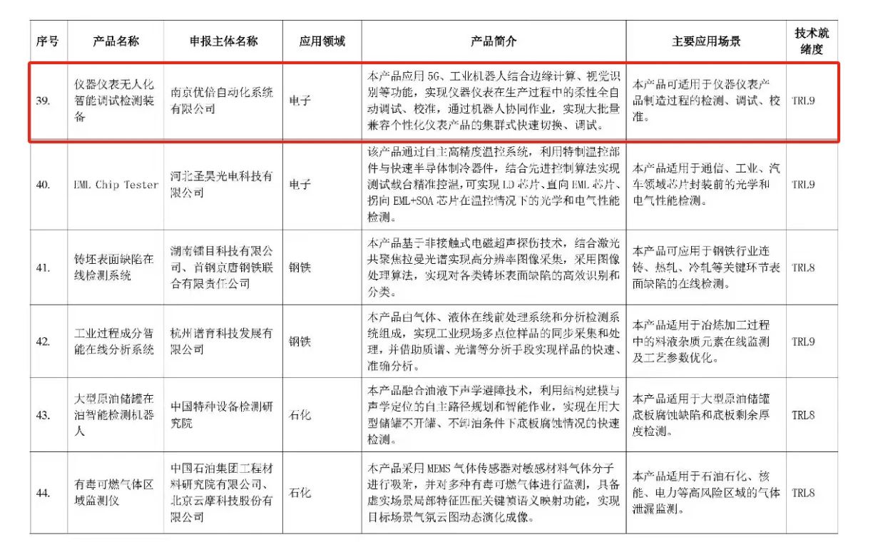 近日,在工業和信息化部裝備工業一司指導下,智能檢測裝備產業發展聯盟公示了《智能檢測裝備創新產品目錄(第二批)》。南京優倍自動化系統、優倍電氣技術公司自主開發的“儀器儀表無人化智能調試檢測裝備”成功入選該創新產品名錄。
