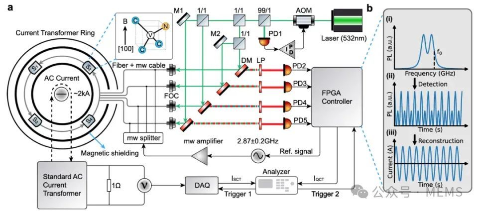 在電力系統(tǒng)中,高壓電流測量至關重要,其可靠性和準確性直接關系到高壓電流模式控制、節(jié)能和電力保護。然而,隨著高壓或超高壓電網(wǎng)的大規(guī)模發(fā)展,電網(wǎng)的寬帶振蕩和諧波共振問題日益嚴重,傳統(tǒng)測量方法難以在寬電流和溫度范圍內滿足高精度測量的要求。金剛石NV色心展現(xiàn)出諸多卓越特性,使其在磁場傳感領域得到廣泛應用,特別是磁場測量可被反演至NV色心能級共振頻率測量,使得金剛石傳感器在高精度電流測量方面頗具應用前景。但是目前金剛石量子傳感器還面臨著集成化過程中的性能下降等問題,導致其在實際應用中存在諸多限制。