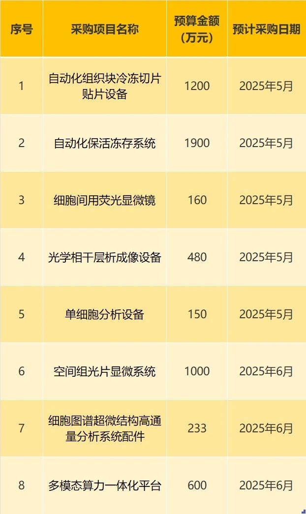 此次的采購計劃包括自動化組織塊冷凍切片貼片設備、自動化?;顑龃嫦到y(tǒng)、光學相干層析成像設備、單細胞分析設備等。這些設備主要用于組織樣品的冷凍切片、?;顑龃妗⒓毎^察與分析、三維結構成像、單細胞轉錄組學數(shù)據(jù)獲取以及細胞超微結構研究等方面。