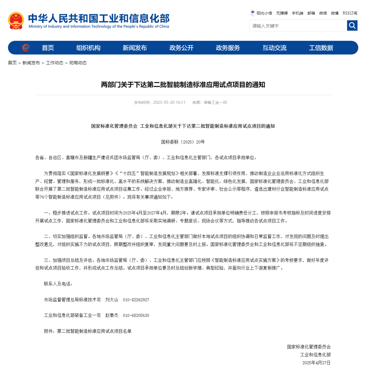 經(jīng)過企業(yè)申報、地方推薦、專家評審、社會公示等程序,國家標(biāo)準(zhǔn)化管理委員會、工業(yè)和信息化部近日下達(dá)第二批智能制造標(biāo)準(zhǔn)應(yīng)用試點項目名單,中核控制系統(tǒng)工程有限公司的“核設(shè)施DCS裝備智能制造標(biāo)準(zhǔn)應(yīng)用試點”,浙江萬勝智能科技股份有限公司的“智能配用電智能工廠標(biāo)準(zhǔn)應(yīng)用試點”,福建順昌虹潤精密儀器有限公司的“面向智能儀表生產(chǎn)的智能工廠標(biāo)準(zhǔn)應(yīng)用試點”,三川智慧科技股份有限公司的“智能水表智能工廠建設(shè)標(biāo)準(zhǔn)應(yīng)用試點”等76個智能制造標(biāo)準(zhǔn)應(yīng)用試點項目進(jìn)入名單。試點項目時間為2025年4月至2027年4月,期限2年。