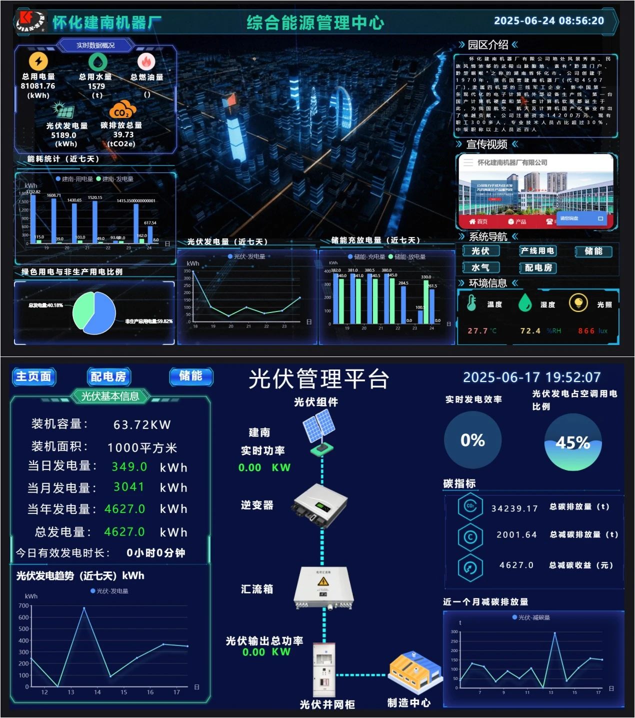 綜合能源管理平臺部署在公司一樓展廳,智能LCD大屏實時動態顯示園區發電及用電耗能情況,平臺軟件部署在云端。公司實現了生產用電與非生產用電分開監測,完成了各車間、各部門水電氣熱數據采集,并監測重點設備能源使用情況。該管理平臺無論從整體架構還是軟件開發,全部由建南自主研發實施。智能微電網項目實施后,公司外部購電量降低了約30%,實現了節能與綠色環保。