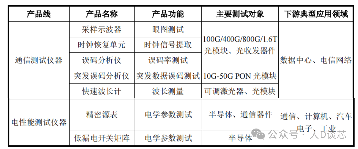 公司電子測量儀器包括通信測試儀器和電性能測試儀器,通信測試儀器主要面向光通信測試,包括采樣示波器、時鐘恢復(fù)單元、誤碼分析儀等核心測試儀器;電性能測試儀器主要包括精密源表和低漏電開關(guān)矩陣,廣泛應(yīng)用于通信和半導(dǎo)體等領(lǐng)域的高精度電學(xué)測試。