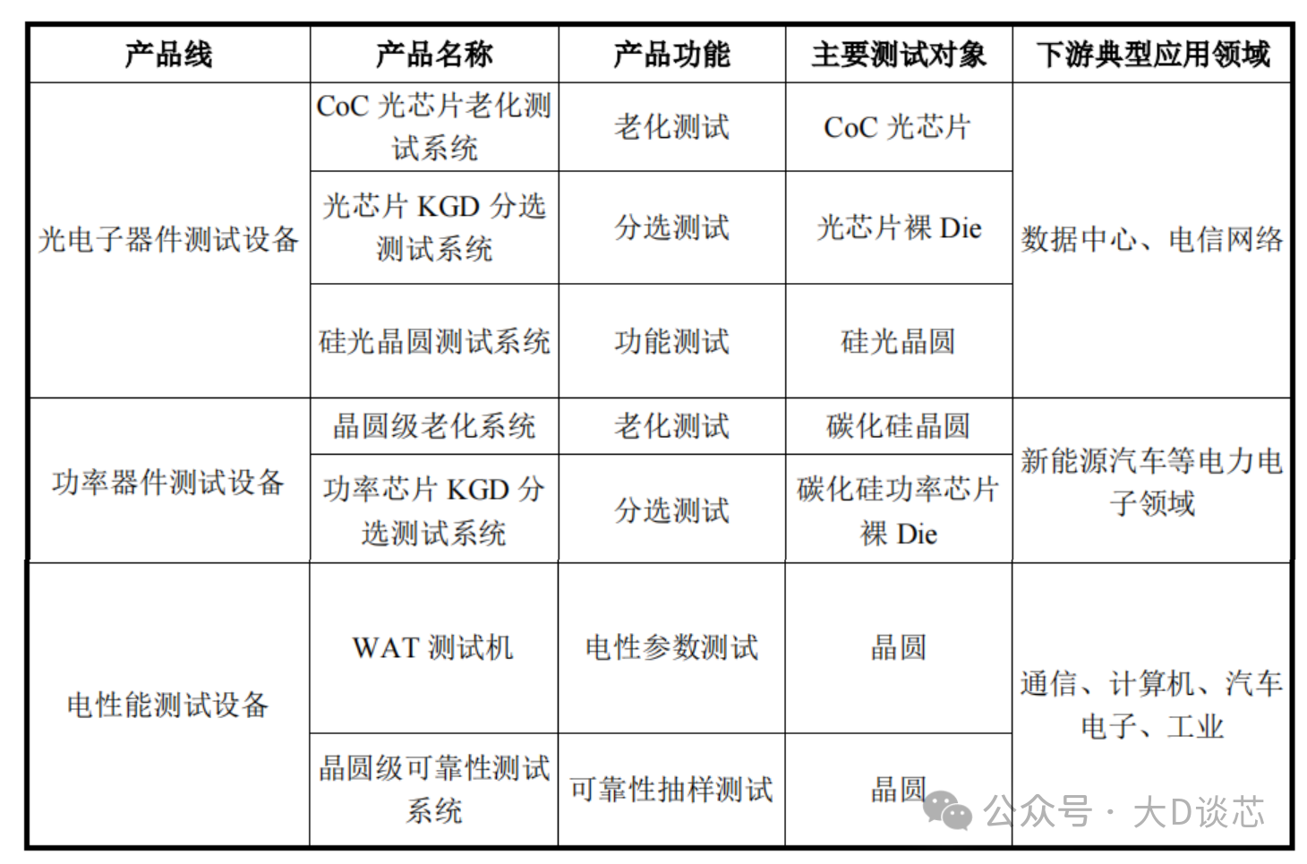 公司半導(dǎo)體測試設(shè)備包括主要面向光通信測試的光電子器件測試設(shè)備(CoC光芯片老化測試系統(tǒng)、光芯片KGD分選測試系統(tǒng)、硅光晶圓測試系統(tǒng)等),主要面向功率器件測試的功率器件測試設(shè)備(晶圓級老化系統(tǒng)、功率芯片KGD分選測試系統(tǒng)等),以及主要面向半導(dǎo)體集成電路測試的電性能測試設(shè)備(WAT測試機(jī)和晶圓級可靠性測試系統(tǒng))。