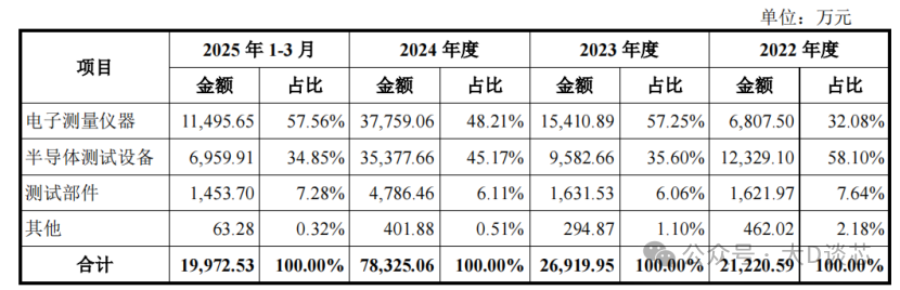 公司產(chǎn)品主要包括電子測量儀器和半導(dǎo)體測試設(shè)備,以及配套的測試部件及服務(wù)。2025年1-3月電子測量儀器的營業(yè)收入金額為11495.65萬元,占比57.56%;半導(dǎo)體測試設(shè)備的營業(yè)收入為6959.91萬元,占比34.85%。