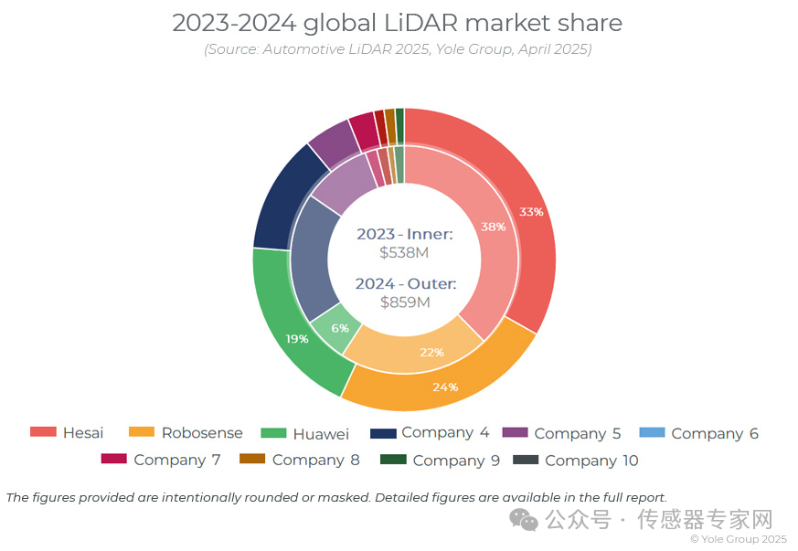 據(jù)今年4月份,咨詢機(jī)構(gòu)Yole Group發(fā)布最新全球激光雷達(dá)產(chǎn)業(yè)報(bào)告《Automotive LiDAR 2025 》(2025車載激光雷達(dá)報(bào)告)數(shù)據(jù)顯示,中國激光雷達(dá)廠商禾賽科技占據(jù)33%的市場(chǎng)份額,其次是速騰聚創(chuàng)(24%)、華為(19%)和圖達(dá)通。這四家中國廠商占據(jù)了88%的市場(chǎng)份額。
