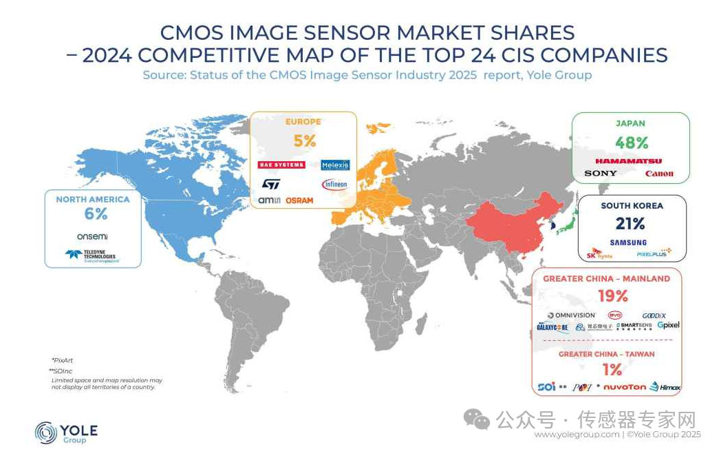 根據(jù)Yole 《Status of the CMOS Image Sensor Industry 2025》(《2025 年 CMOS 圖像傳感器行業(yè)現(xiàn)狀》)報(bào)告顯示,以豪威集團(tuán)(原韋爾股份、Omnivision)、格科微(Galaxycore)、思特威(Smartsens)、比亞迪(BYD)、長(zhǎng)光辰芯(Gpixel)、匯頂科技(Goodix)、銳芯微為代表的中國大陸CMOS圖像傳感器產(chǎn)生,占據(jù)全球19%的市場(chǎng)份額。此外,中國臺(tái)灣省的原相科技、晶相科技、敦泰科技等廠商,合計(jì)占1%市場(chǎng)份額。