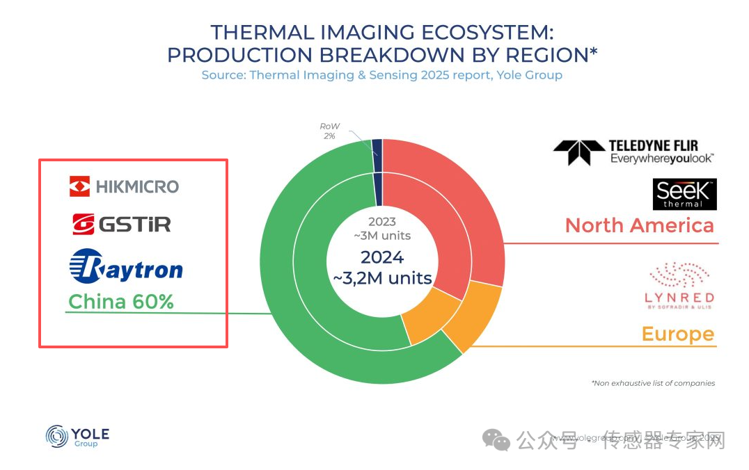 根據(jù)Yole 8月份剛剛發(fā)布的最新《Thermal Imaging and Sensing 2025》(《熱成像與傳感2025》)報(bào)告顯示,以??滴⒂埃?/span>Hikmicro)、高德紅外(Gstir)、睿創(chuàng)微納(Raytron)為代表的中國紅外傳感公司,占據(jù)全球60%的市場(chǎng)份額。