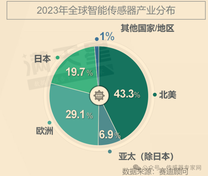 然而,在高精尖的智能傳感器市場(chǎng),2023年全球智能傳感器產(chǎn)業(yè)由北美、歐洲、日本主導(dǎo),其中,北美占比最高,達(dá)43.3%,歐洲占比29.1%,日本占比19.7%,亞太地區(qū)(除日本)占比6.9%,其他國家/地區(qū)占比1%。
