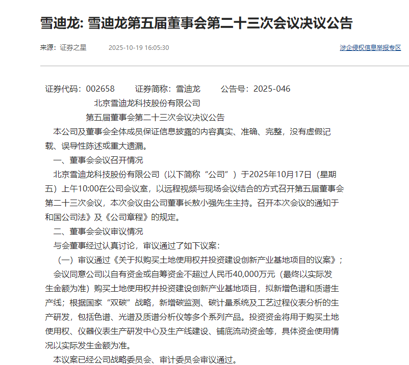 10月19日晚間,北京雪迪龍科技股份有限公司(股票代碼:002658)發(fā)布一則重磅公告,擬投資不超過4億元,購買位于北京市昌平區(qū)的國有建設用地使用權并建設包括色譜和質譜生產線的創(chuàng)新產業(yè)基地項目。