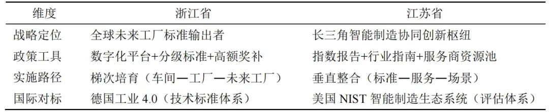 在實(shí)施路徑維度:浙江省推行梯次培育路徑,從智能車間到未來工廠分階段進(jìn)階;江蘇省實(shí)施垂直整合,以標(biāo)準(zhǔn)引領(lǐng)、服務(wù)支撐、場景落地的方式構(gòu)建產(chǎn)業(yè)生態(tài)。