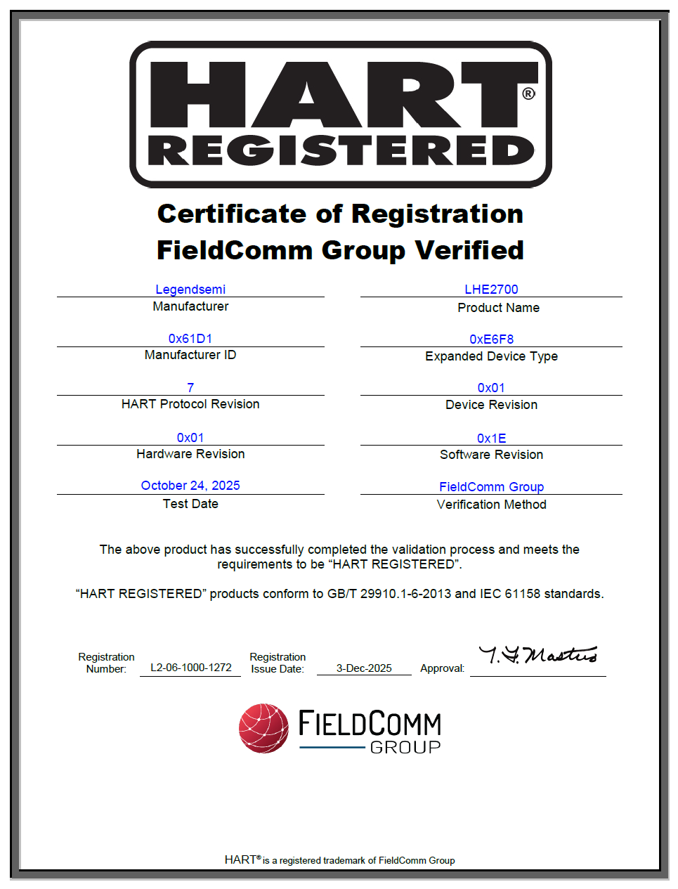 FieldComm Group 作為 HART 協議的權威管理機構,其認證以嚴苛的技術標準著稱,涵蓋物理層、數據鏈路層、應用層全鏈路測試,以及 EDD/FDI 設備包兼容性驗證。通過該認證,意味著 LHE2700 可無縫對接主流 DCSPLC 控制系統及 HART 手操器,徹底消除不同廠商設備間的通信壁壘,為工業客戶提供高可靠的 “即插即用” 解決方案。
