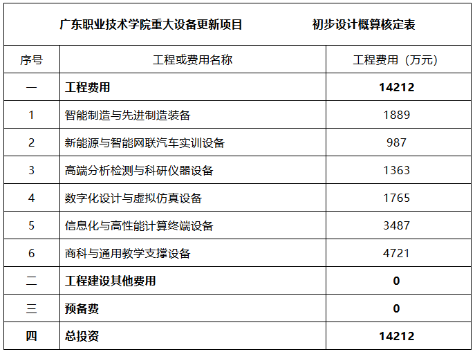 項目概算總投資14212萬元,均為設備購置費。項目建設資金由超長期特別國債安排6792萬元,其余資金由學校自籌解決。